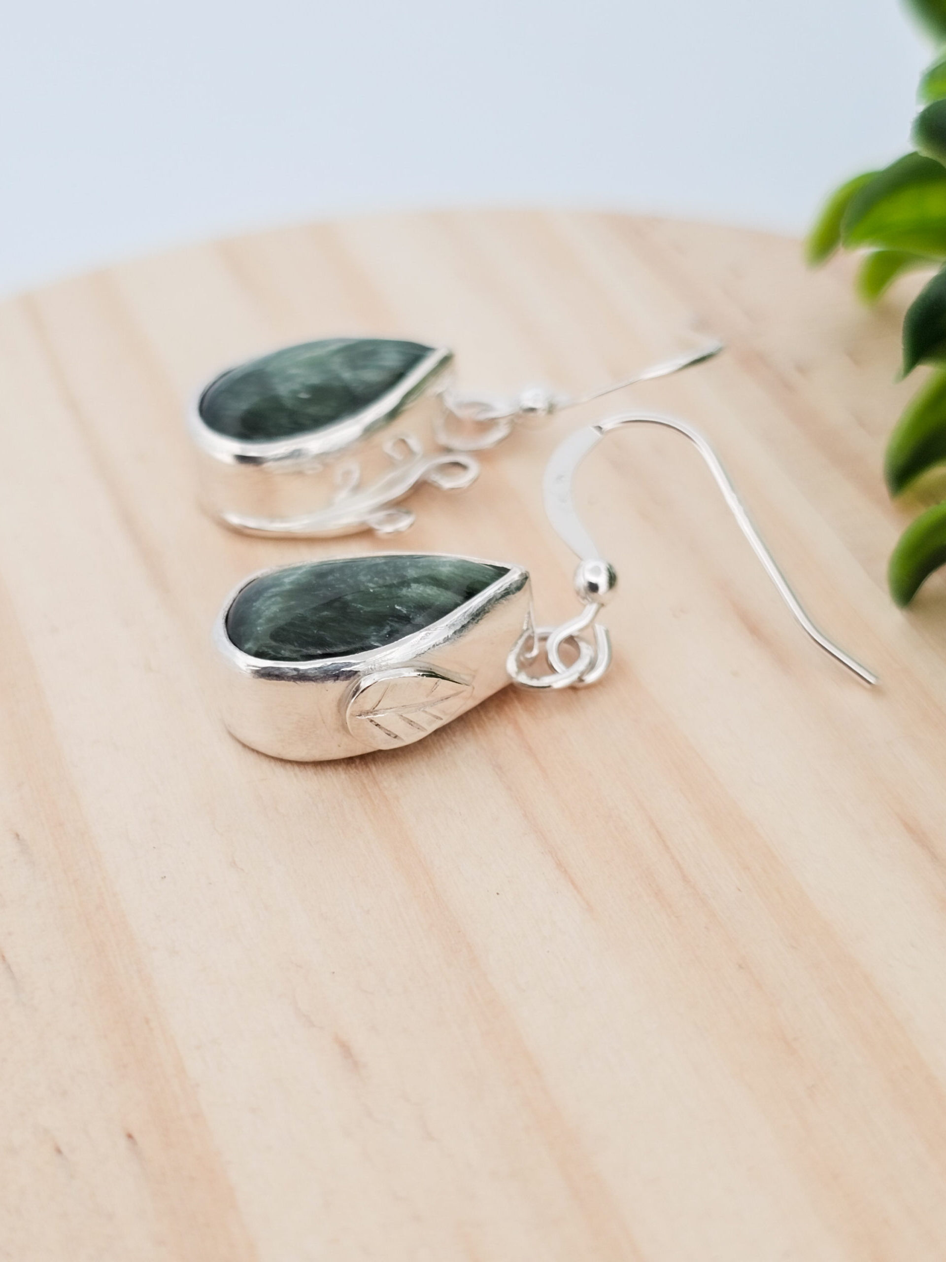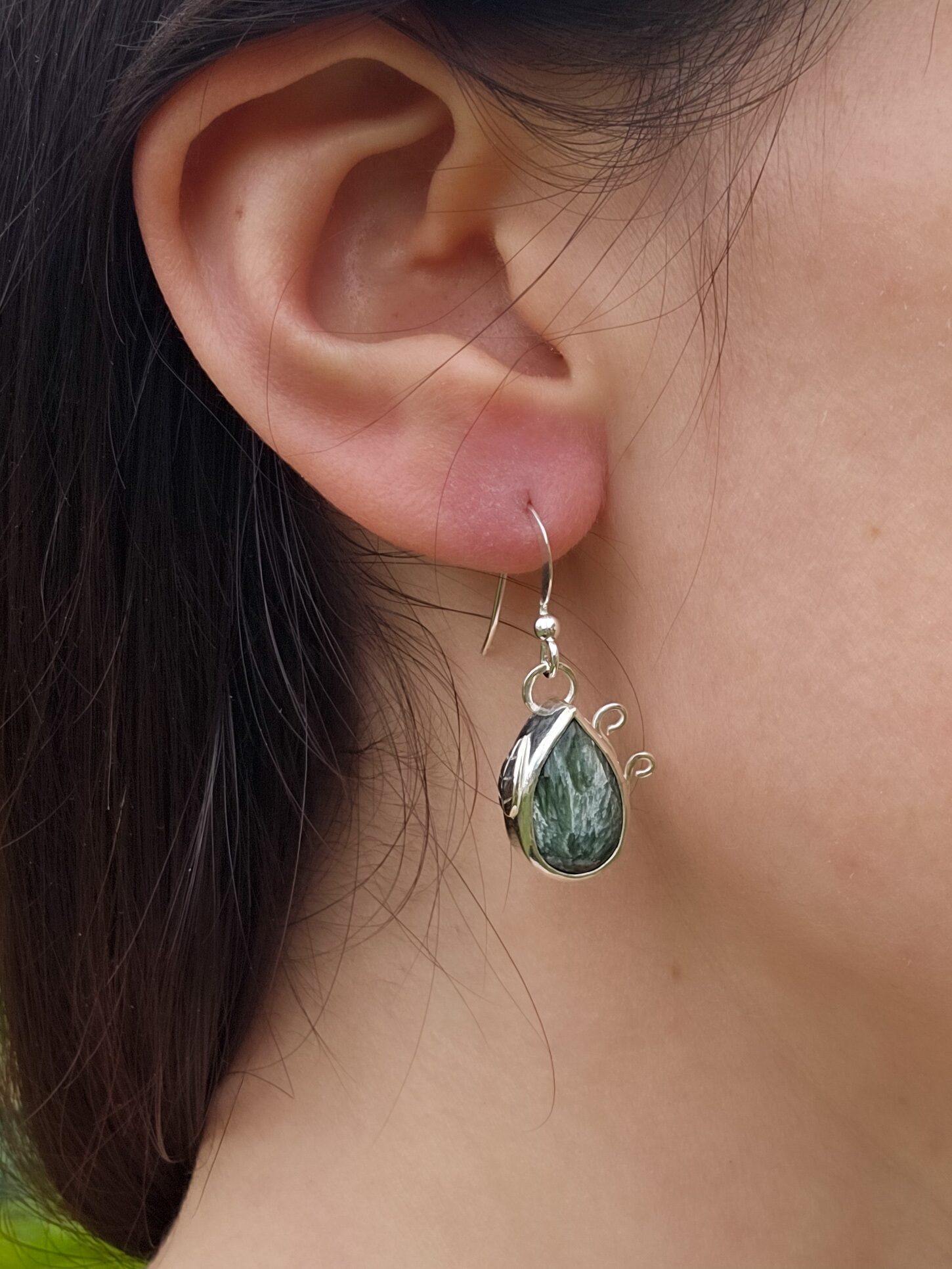 Ces boucles d’oreilles en argent 925 sont serties de deux Séraphinites de Russie. Tous les bijoux L’Écrin du Colibri sont en pierres naturelles non teintées.