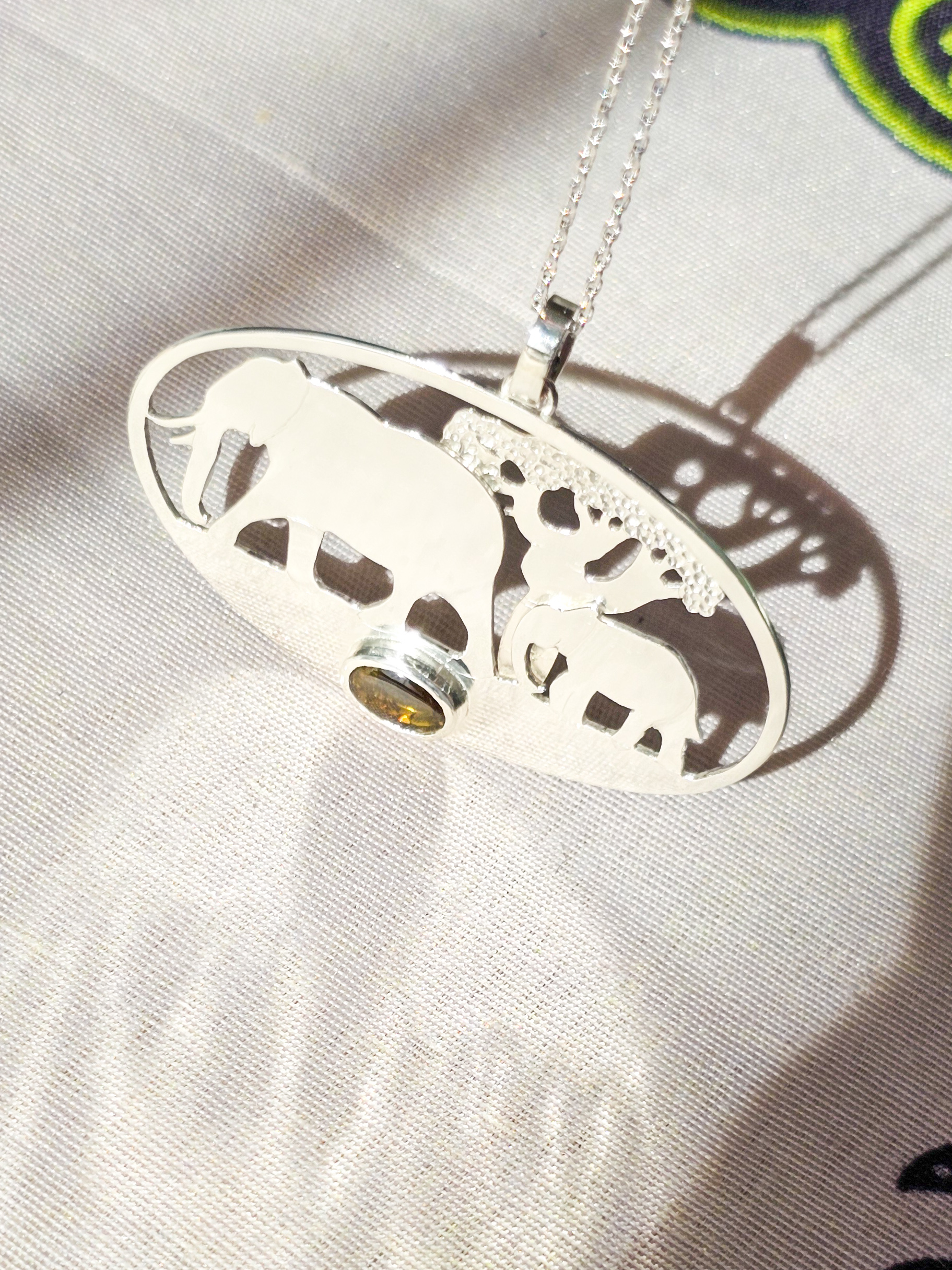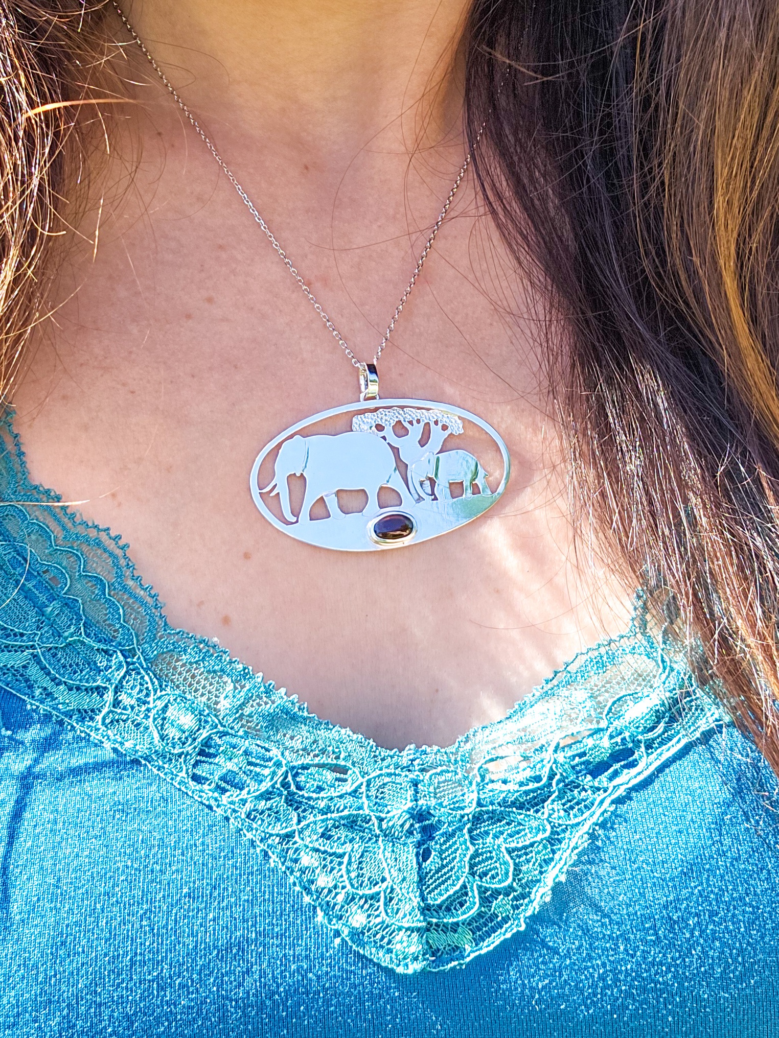 Ce pendentif a été créé pour célébrer la beauté et la sagesse des éléphants que l’on peut voir lors des safaris en Tanzanie. Il est serti d’une tourmaline dichroïque, qui semble orangée/ambrée, ou verte selon l’angle de vue et la luminosité.
